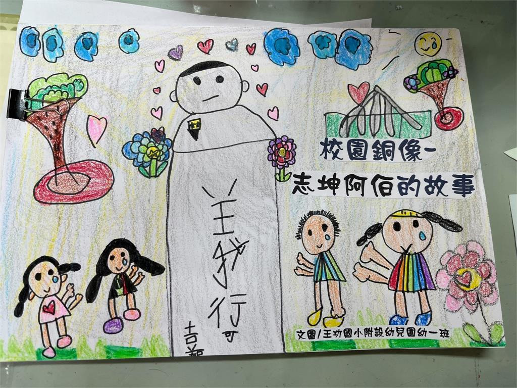 有些校園裡頭會佇立偉人銅像,希望讓學生記得這些古人的義舉,並將這樣的精神流傳下去。彰化王功國小為了紀念38年前的校友林志坤英勇救人的往事,在校園內替他打造一座半身銅像,希望讓學生記住他的故事。不過隨著時代變遷,許多學生漸漸記不得這座銅像背後的事蹟,還反問老師「這是神像嗎?」,因此校方特別舉辦了「校園銅像-志坤阿伯的故事」繪本活動,讓小朋友自己動手做繪本,也讓林志坤的故事永留心中。王功國小校長謝格倫分享,在1985年6月27日,當年才12歲的林志坤和朋友們一塊到王功排水附近戲水遊玩,結果有位同伴不慎掉進排水溝裡,當時林志坤立刻跳入水中救人,沒想到他將朋友救起後,自己卻不幸溺斃。後來學校為了紀念林志坤英勇救人的舉動,在校園裡為他打造了一座半身銅像,並在上頭刻下「義行可嘉」的字樣,藉此表揚他的事蹟,也希望讓學生記住這樣偉大的情操。不過由於銅像上只寫著「王功國小第40屆畢業生林志坤,於6月27日在郊遊時救起一溺水之兒童後,而自己不幸慘遭滅頂,義風可嘉,特立此銅像以資紀念」。讓許多學生看了還是「霧煞煞」,就有學生童言童語地詢問老師「這是神像嗎?」,在這樣的契機下,王功國小附幼的老師開始籌備「校園銅像-志坤阿伯的故事」繪本活動,讓小朋友更加了解銅像背後的故事,還邀請了林志坤當年的老師林繁夫到學校,讓小朋友們親自訪問林繁夫,更加了解林志坤的故事。後來王功國小附幼的小朋友們開始動筆,將林志坤的故事畫成一幅又一幅的圖畫,藉此紀念祂當年英勇救人的事蹟。校方也將小朋友的畫作集結成了繪本,並舉辦了新書發表簽名會。校長謝格倫透露,這個活動希望能讓小朋友激發創作靈感,也讓他們都能記得大學長志坤阿伯「義行可嘉」的故事,藉此讓孩子們將勇於助人的精神繼續傳承下去。