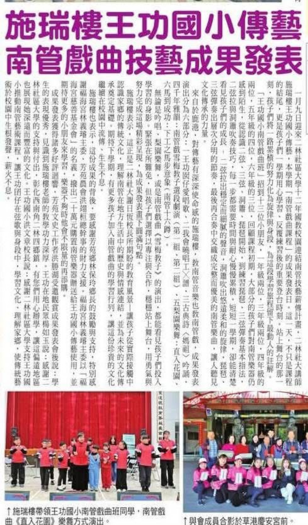 這份成果的背後,特別感謝福海宮林義璿主委、芳苑農會洪翊桓總幹事與洪文章校長的大力支持,也感謝二林社大施瑞樓老師用心且耐心的指導,讓傳統南管藝術得以在校園中深耕,陪伴孩子們一步步走上舞台,發出屬於自己的聲音;這也正是二林社大謝日恆校長希望讓學生從實際接觸中認識家鄉的傳統文化,進一步了解南管在地方生活中的歷史意義,也為未來的傳承打下基礎,期盼下期更多學生加入南管戲曲的學習行列。