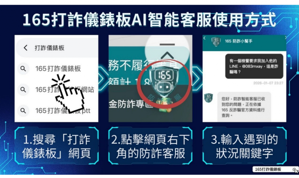 | 二、 | 為因應詐騙手法快速演變,內政部警政署於「165打詐儀錶板」導入AI智能客服小幫手,整合防詐資料庫提供即時互動諮詢,可依民眾描述情境辨識詐騙風險並提供具體處置建議;另具備涉詐網址即時查詢功能,可判斷網站是否具詐騙風險。 |